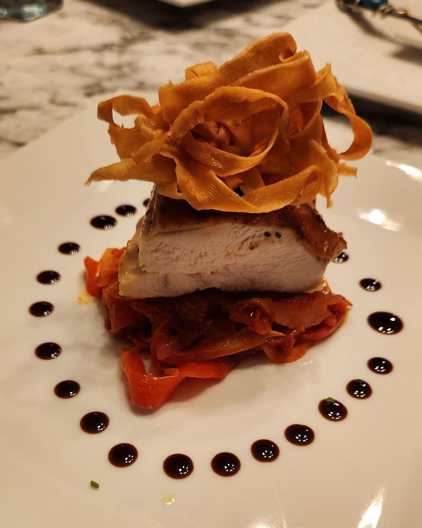 Assembling this dish is entirely up to you. You did all the work so turn this into your own vision. Express yourself. What do the elements say to you? Typically height makes food more visually appealing so I chose to stack it by placing my chicken on top of the basquaise sauce and layer that with a mound of the fried parsnips. I garnished the plate with little dots of balsamic vinegar glaze.
